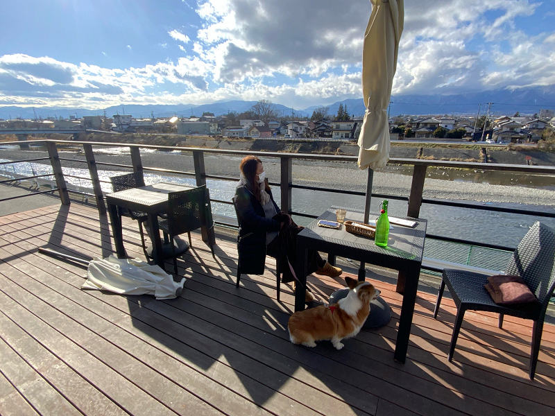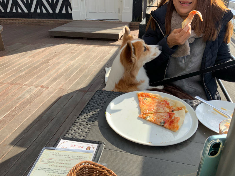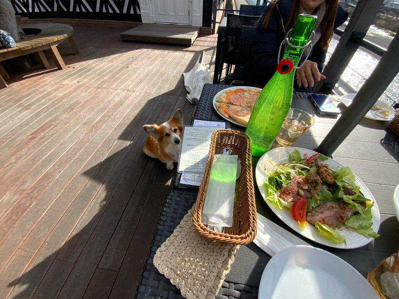 レジの所に店員さんが居たので「犬同伴で食事出来ますか?」店員さん「寒いですが外のテラス席はワンちゃん同伴出来ます、テラスは直ぐに案内出来ます」と!、私「テラス席でお願いします」。