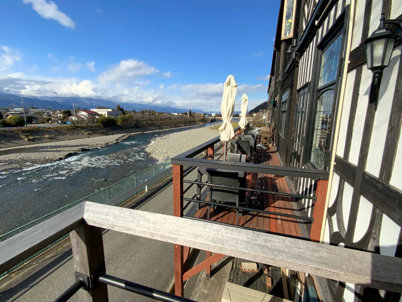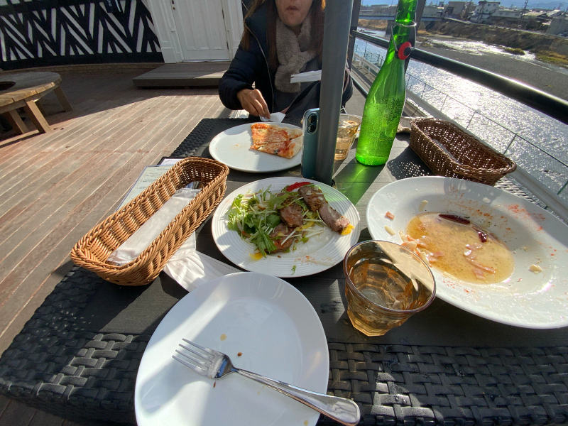 この日意外と寒くは無い(晴れで風も無いので)店舗左側のウッドデッキに在るテーブル席案内されました。
