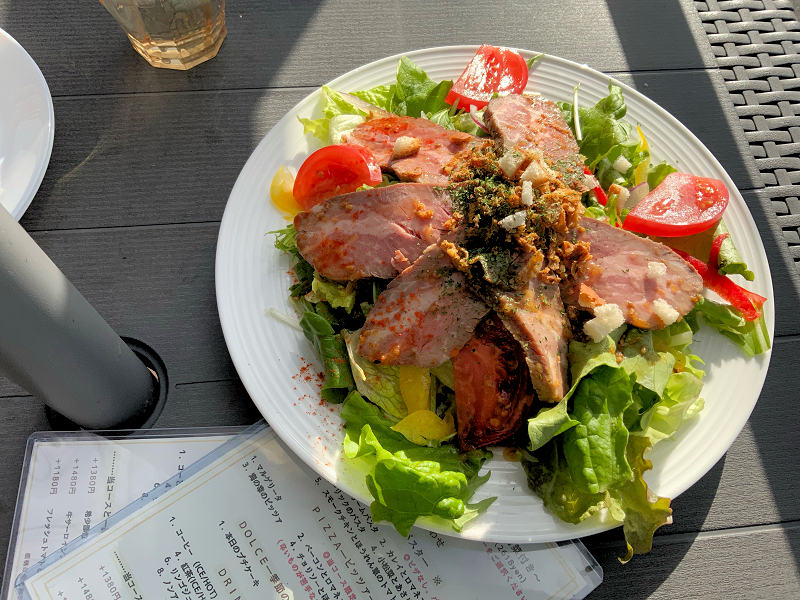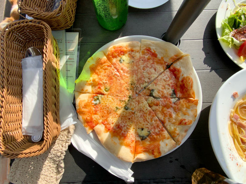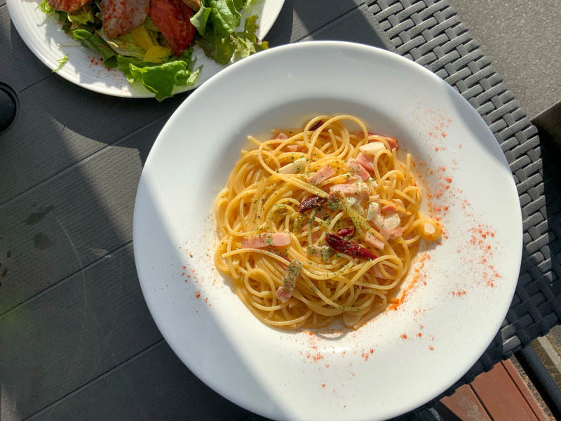 サラダ 〜 ペペロンチーノ 〜 ピザの順にきました。