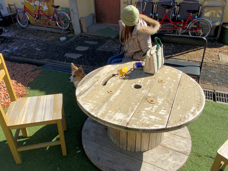 見ると電線やケーブルのドラム(テーブルの様です)と木製イス(テラス席でした)。