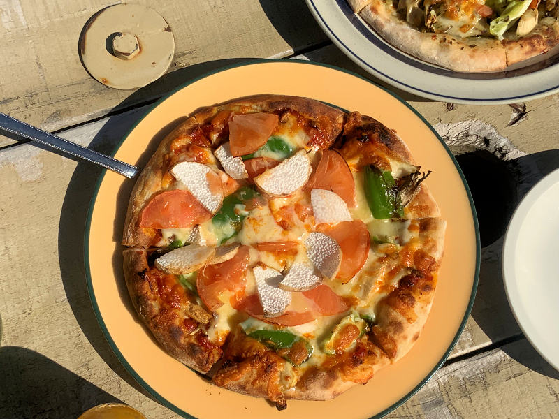 ついでに注文、トマトソースのピザ(1500円)、きのこのピザ(1300円)、りんごジュース(350円)ホットコーヒー(400円)を注文。