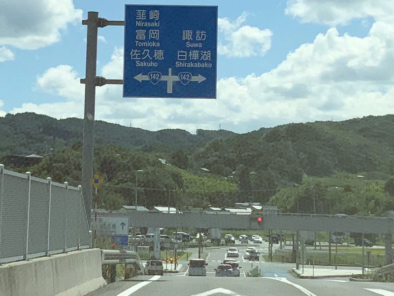 上信越自動車道 佐久小諸JCT@A 〜 小諸御影料金所(中部横断道 無料区間B)〜 7km先「佐久南 立科出口C)〜 900m先「佐久南IC信号」右折(国道142号諏訪 白樺湖方面D)〜 1km先幅員減少右車線へE 〜(佐久南IC信号より9.7km先の)ギグナススタンド直ぐ先「協和信号」左折(交差点にJA佐久浅間オートパル有りF)〜 1.2km先一時停止G 〜 200m先左右に無料の駐車場有りますH