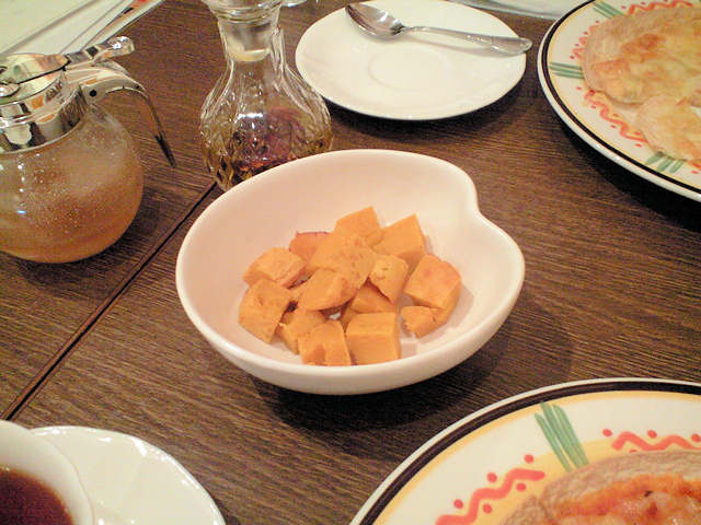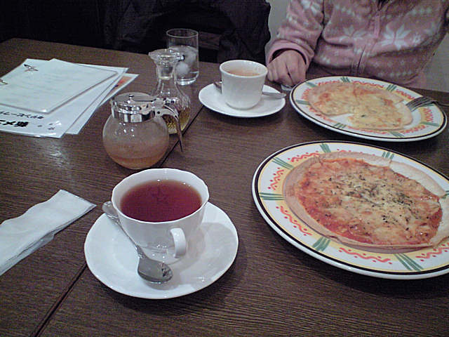 二人とも、ピザセットを頼んだ。小さなサラダとピザ(小さめ)と飲み物で 735円。人間の食後に、うーにーのために天使のかぼちゃ(273円)も頼んだ。