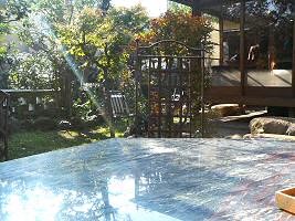 広めの個人住宅の庭という感じの中に、幾つかのテーブルがあった。他にお客さんもいなかったので、一番大きなテーブルを利用させていただいた。6人は座れるだろう。
